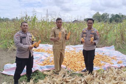 BATUBARA, Kapolsek Indrapura AKP Reynold Silalahi, bersama personel Polsek Indrapura melaksanakan kegiatan pendampingan petani dalam panen jagung di lahan binaan Polres Batubara yang berlokasi di Perk...