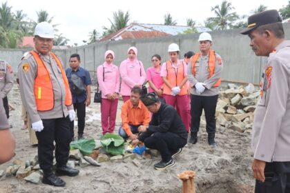 BATUBARA — Kapolres Batubara AKBP Doly Nelson Nainggolan, didampingi Ketua Bhayangkari Cabang Batubara Ny. Stephanie Doly, melaksanakan peletakan batu pertama pembangunan gedung Satuan Pelayanan Pemen...